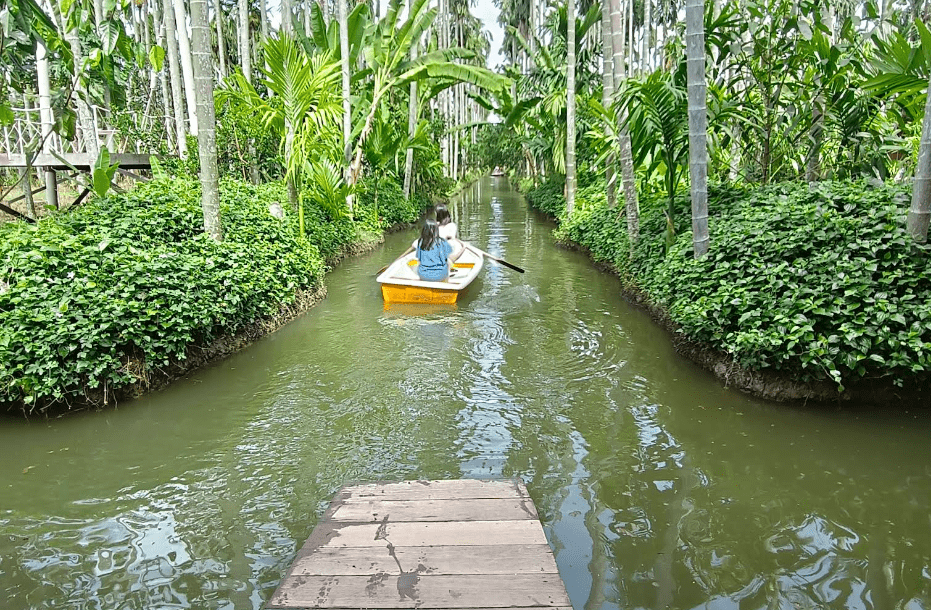 Caféen ligger omgivet af grønne rismarker, små vandløb og palmer, og man kan sidde i hyggelige bambuspavilloner, på bådebroer eller ved vandkanten og lade tiden gå i stå. Det er en favorit blandt par, naturfolk og alle, der har brug for et pusterum.