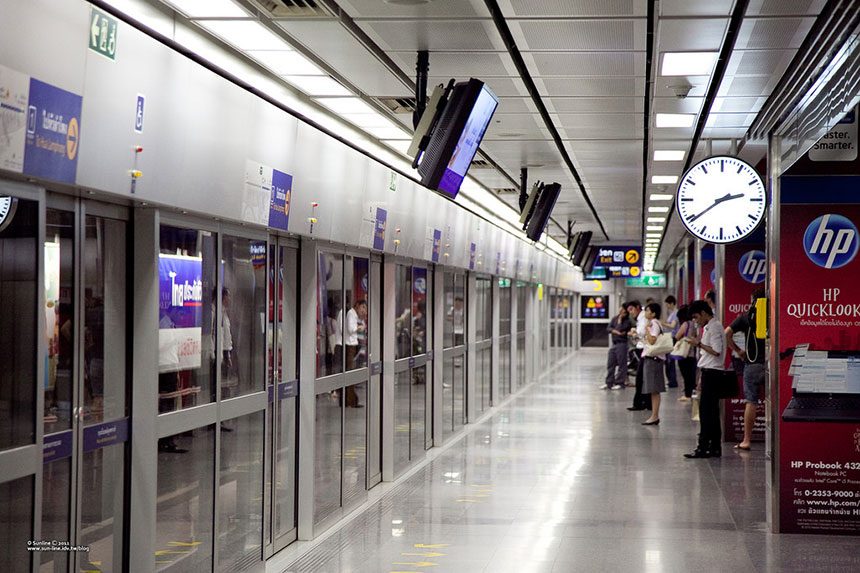 BTS Skytrain er en af de mest effektive måder at komme rundt i Bangkok på. Toget kører på skinner hævet over byens travle gader, hvilket gør det hurtigt og pålideligt – især i myldretiden, hvor vejtrafikken kan være ekstremt tæt. Togene køre fra kl. 05:30 – 00:00 og kommer hvert 3-5 minut.