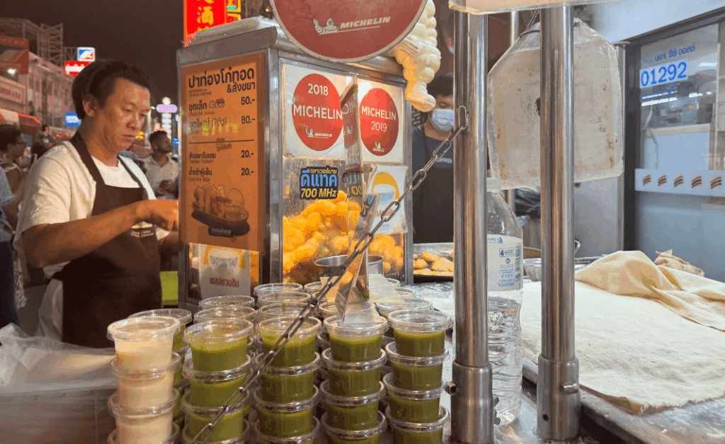 Pa Tong Go Savoey er Bangkoks mest berømte sted for pa tong go – thailandske friturestegte dejstykker, som minder om mini-donuts, bare sprødere, lettere og langt mere vanedannende. Beliggende i hjertet af Chinatown ved Yaowarat Road, har denne bod løftet en simpel morgenklassiker op på gastronomisk niveau – med en velfortjent Michelin Bib Gourmand som bevis.