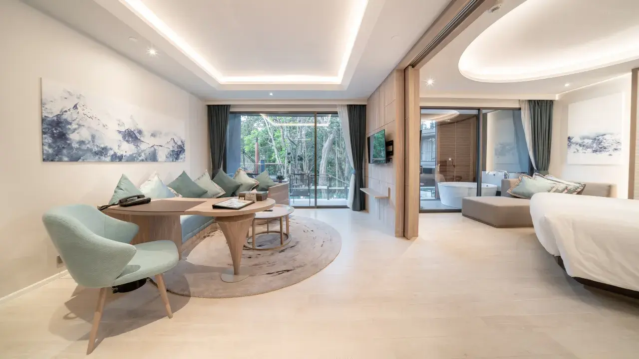 Hotellet har lyse, rummelige værelser og suiter med store senge, balkon, badekar og udsigt til pool, bjerge eller hav. Flere værelser har direkte pooladgang eller privat jacuzzi – ideelt til afslapning i fredelige omgivelser.